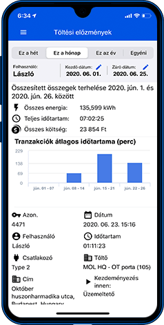 Visszanézheted korábbi töltéseidet, heti, havi vagy éves bontásban, de beállíthatsz tetszőleges időszakot is. Megmutatjuk az összes felvett energiamennyiséget, átlagos időtartamot, teljes időtartamot, költségeket, helyszíneket, dátumokat…felsorolni is nehéz. Szerintünk mindenki megtalálja a számára szükséges információt, mi készültünk.